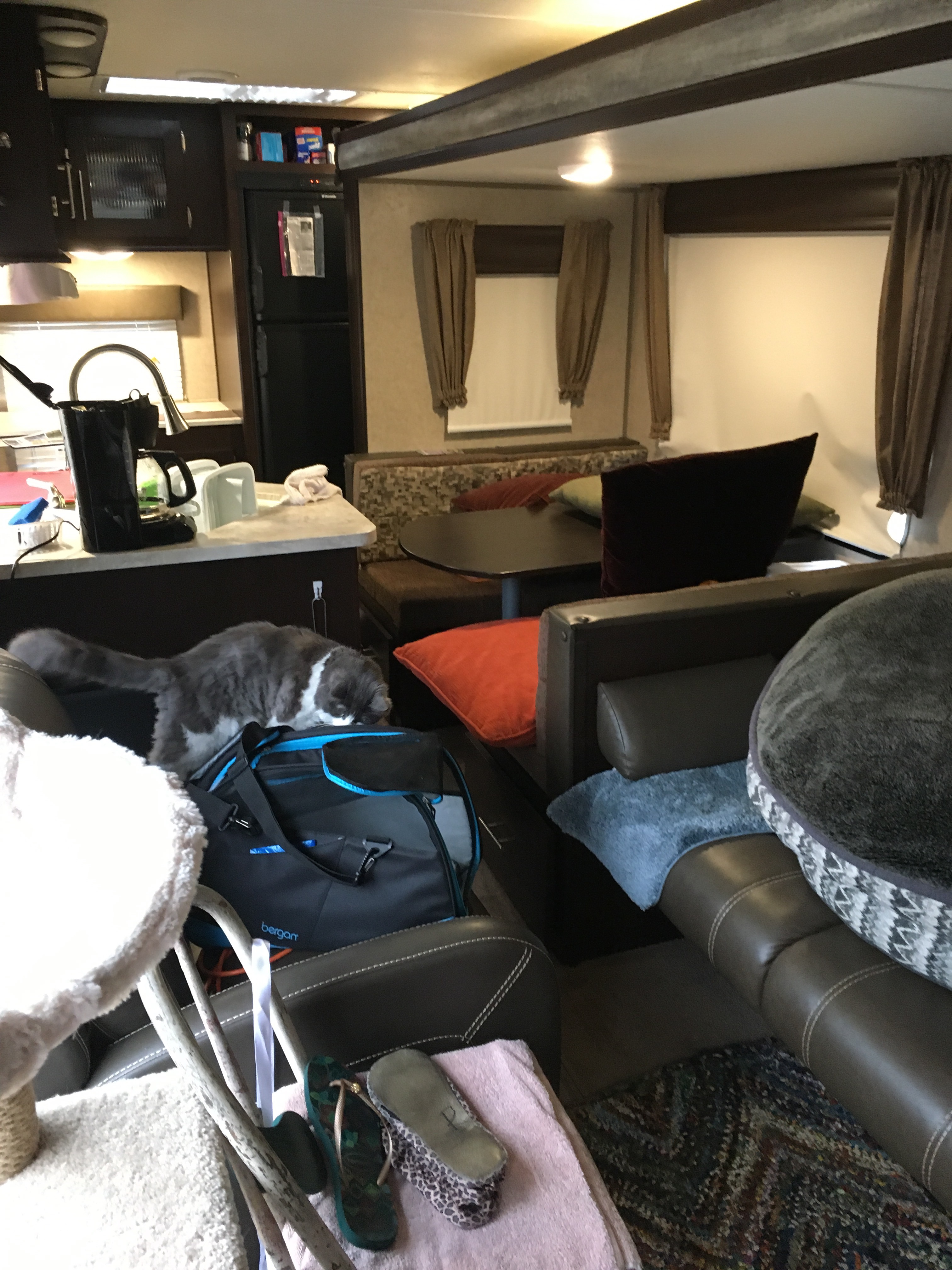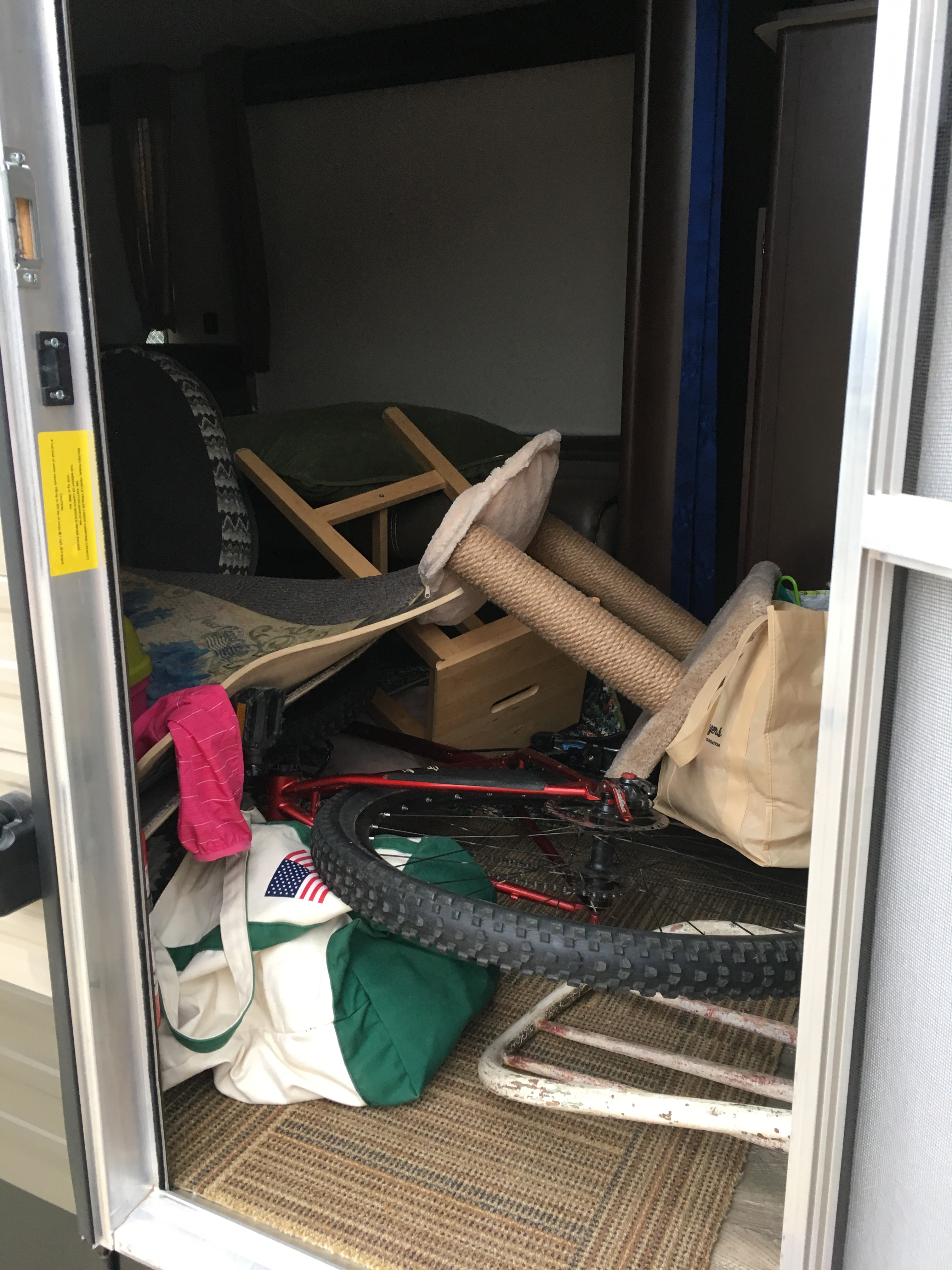 Having to re-arrange all of the over-weight area ruined my plan so I began to dig out the items one by one. Once that was done and the power turned on (listening for that popping sound indicating our surge protector was humming) we cranked the AC, opened up the slide-out and brought the pets in.