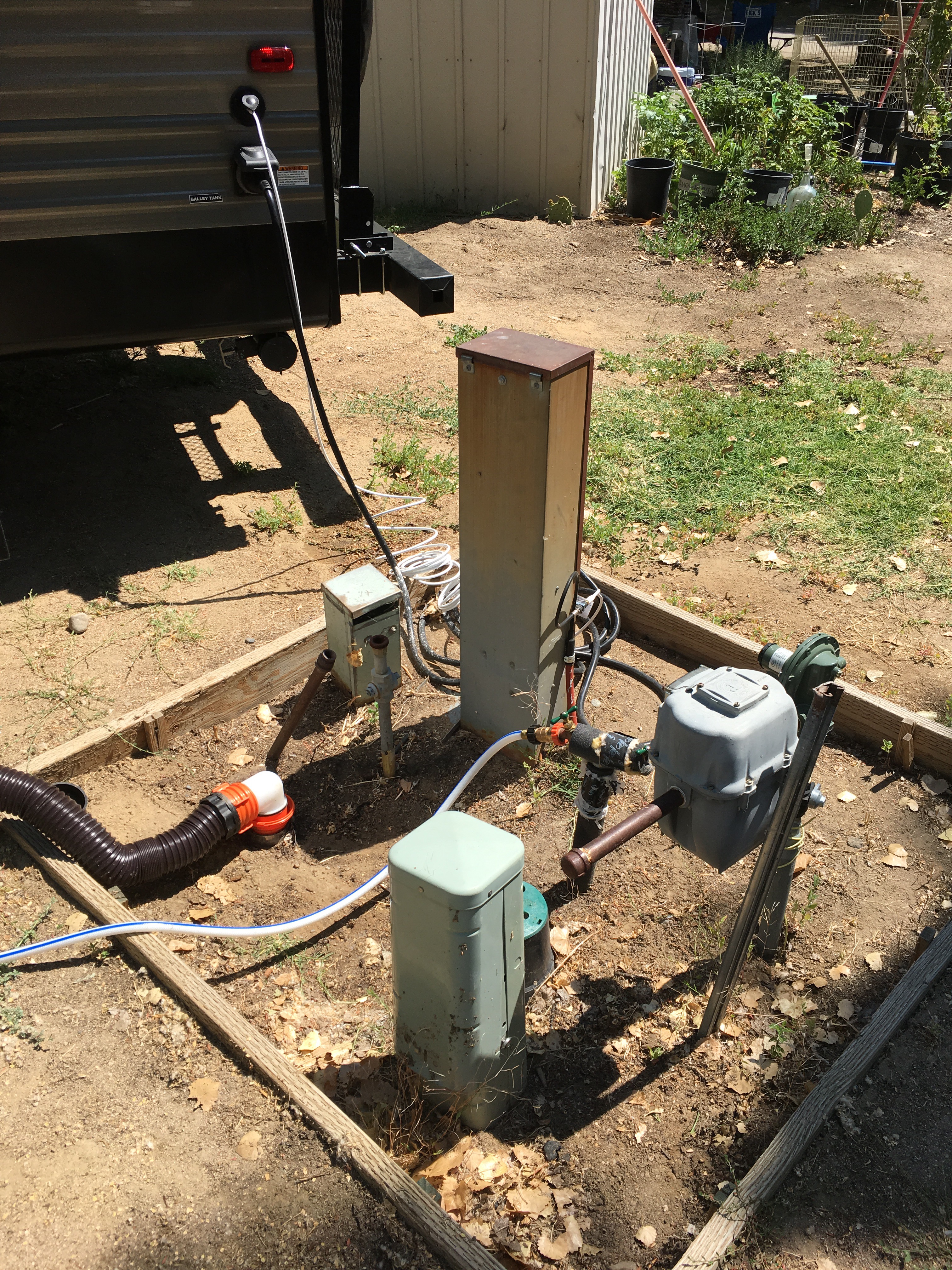 I had to “plug us in”. That tall structure in the center was PACKED with spider webs and I had to go upside down to find the 30 amp plug. IN THE SUN.