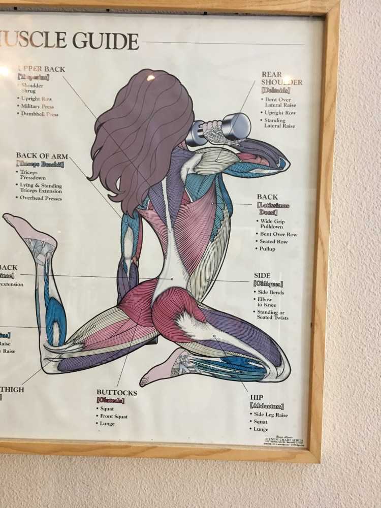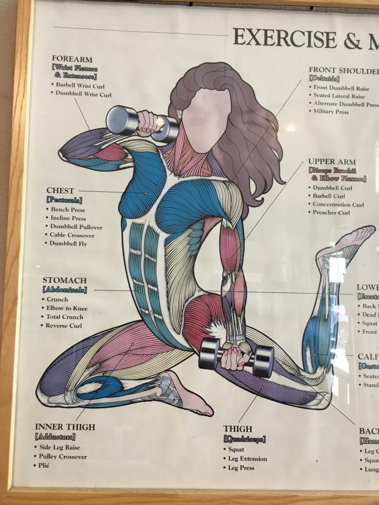 This poster was on the wall at the gym I was part of: Total Woman in Glendale California. This is where I met my running coach Gudrun Armanski…who taught me how to NOT HATE running and began personal training life. I studied this poster because I love this sort of stuff to begin with. Look at all of the ideas it gives PLUS the machines or equipment is right here!