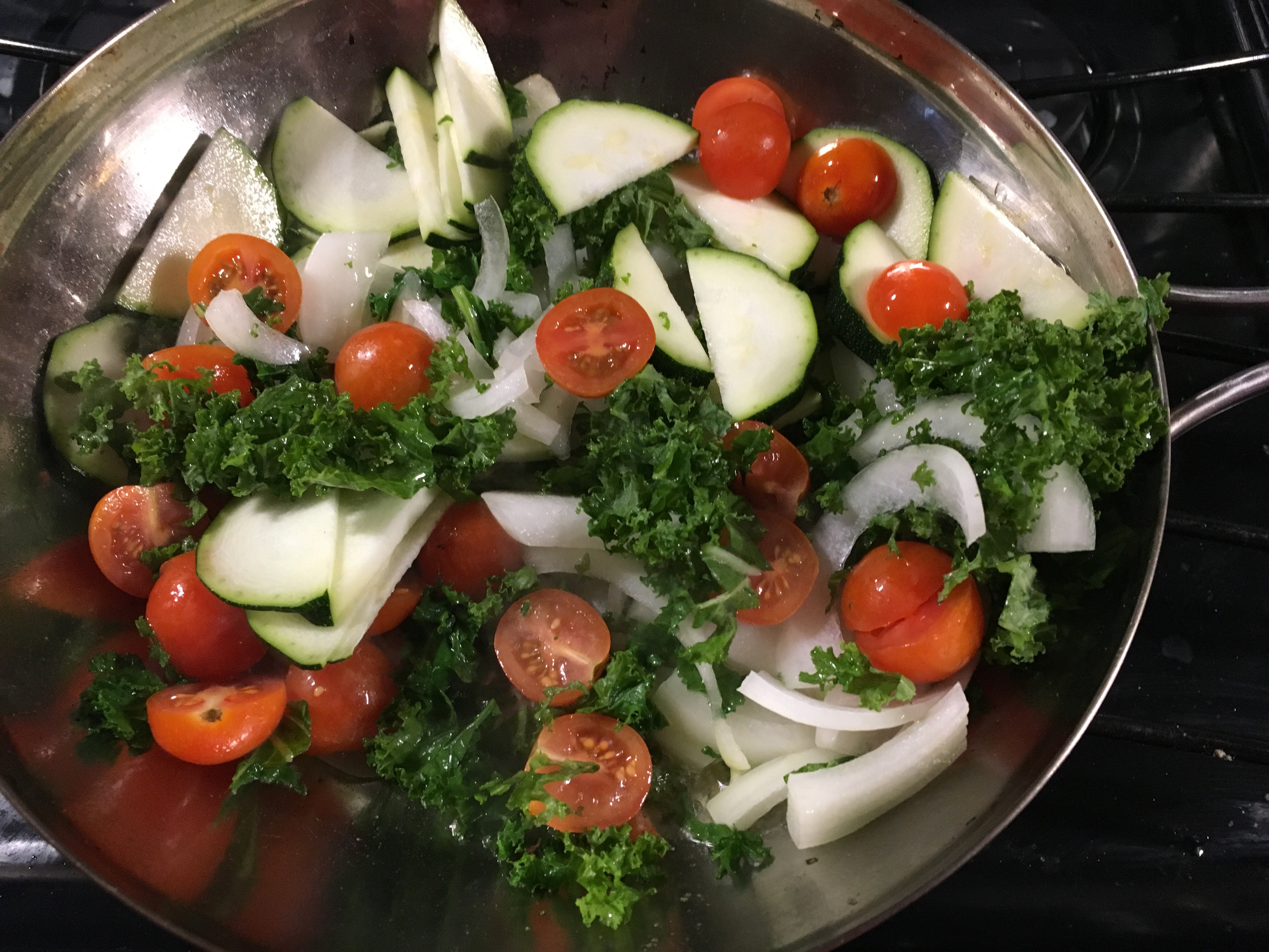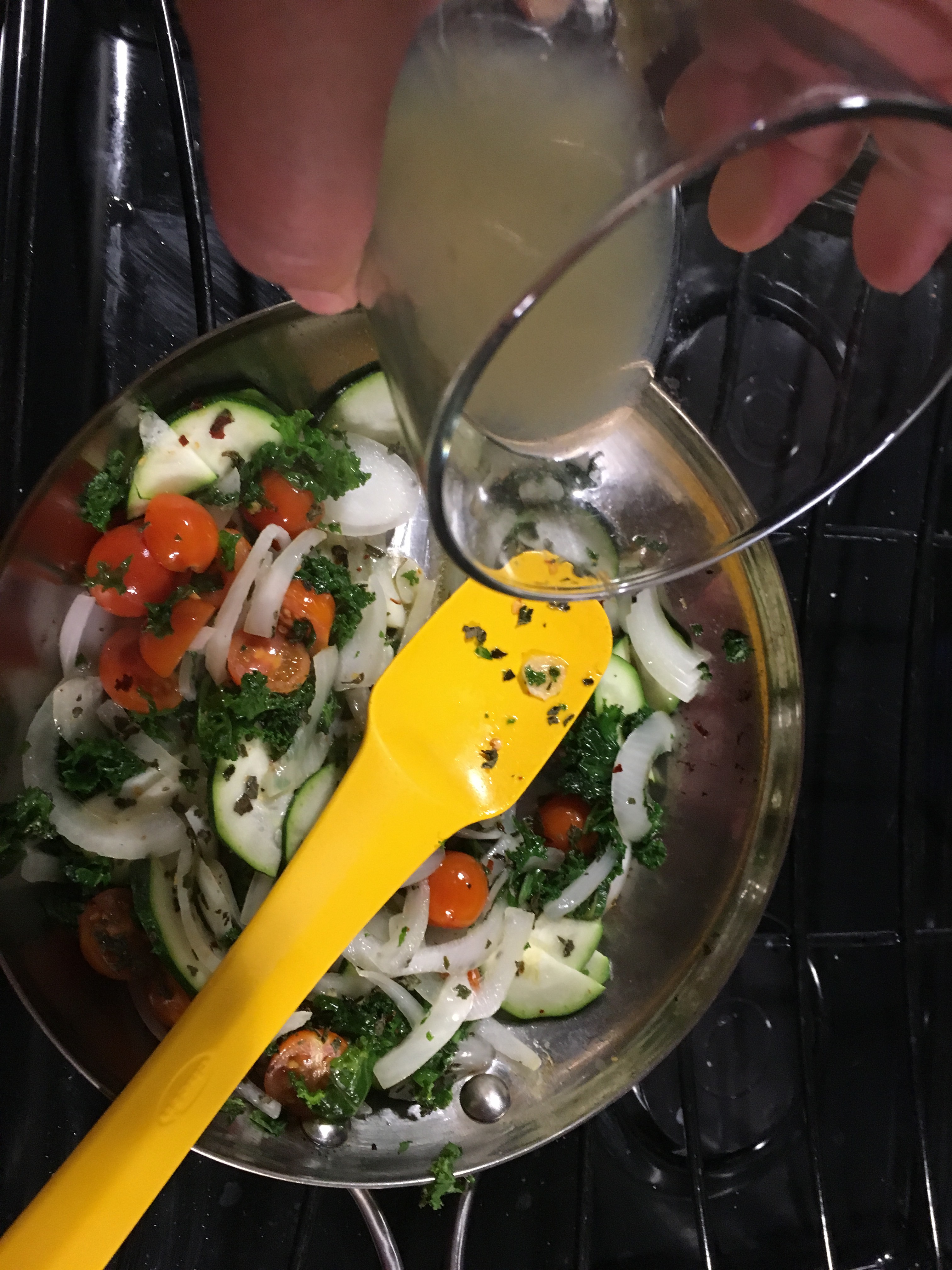 In a giant skillet (or wok if you’re lucky) place 2T of vegan butter. Let it get shimmery hot then add garlic. After about a minute add ALL of the remaining vegetables and beans. Stir in the basil and pepper. Lastly, add the lemon juice! Let simmer.