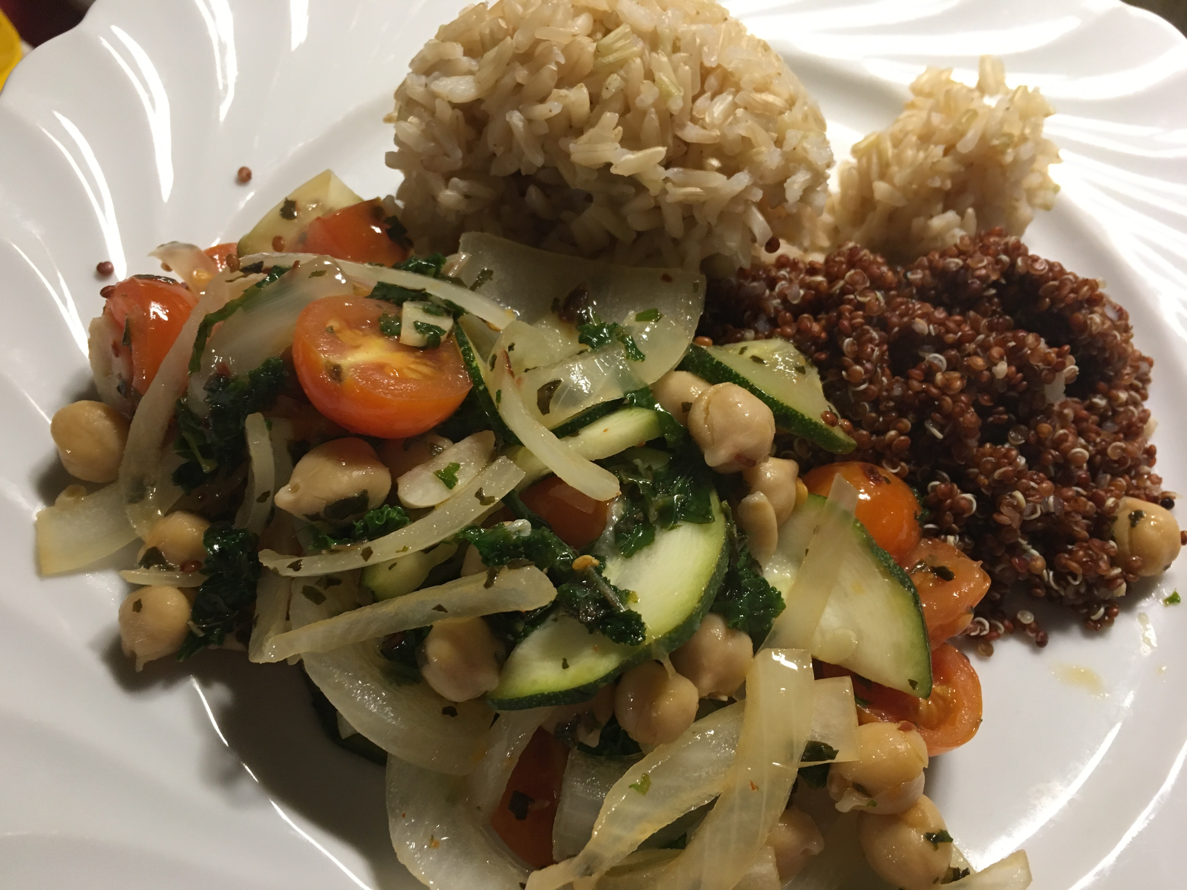 Red Quinoa, Brown Rice topped with: buttery lemon veggies saute onion, garlic, cherry tomato, green zucchini, kale and garbanzo beans. Added 1T basil (sweet) and 1/2t red chili peppers. 1T of fresh lemon juice and 2T vegan butter.