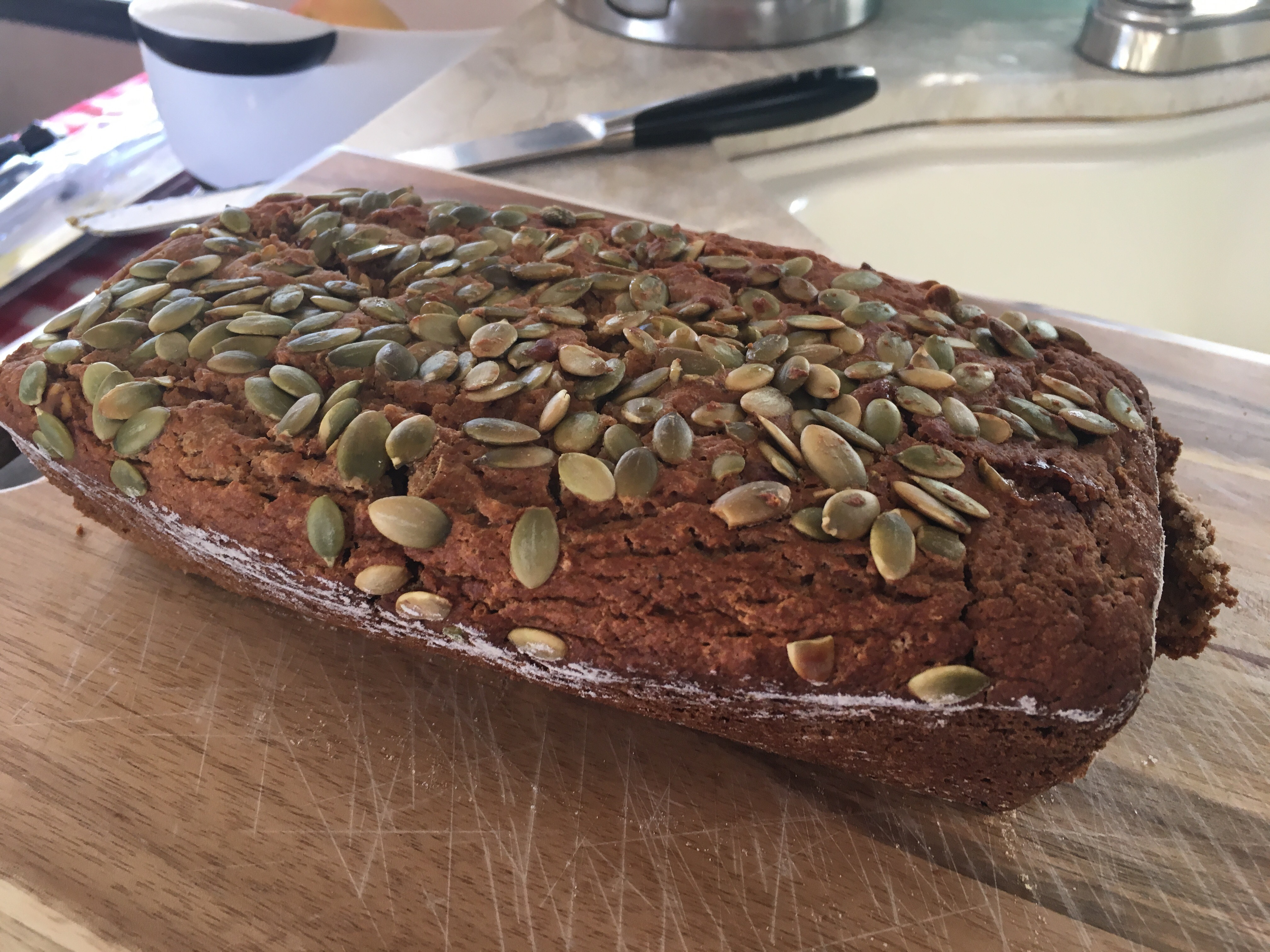 Evenly sprinkle pepitas on top of bread.
