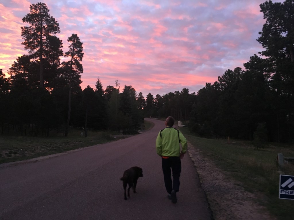 Today’s morning walk started off with brilliant pink and orange skies. We live where there are a lot of trees and I’ve had to hike to an open viewing space to watch the sunrises which is good for me and Kona.