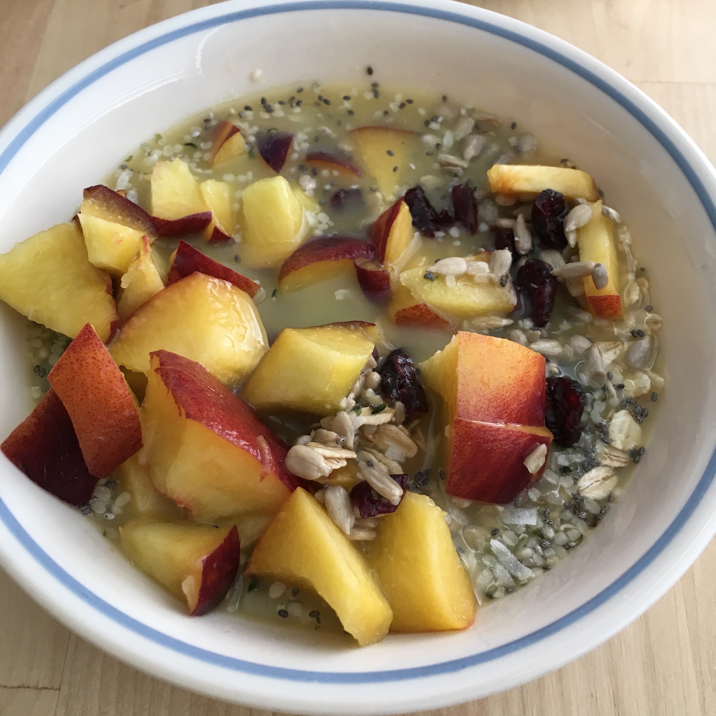 Blend wet ingredients together (I put the chia into the almond “milk”). With a fork stir a bit to really get everything well mixed. If you have a few minutes, let it all stand and become blended.